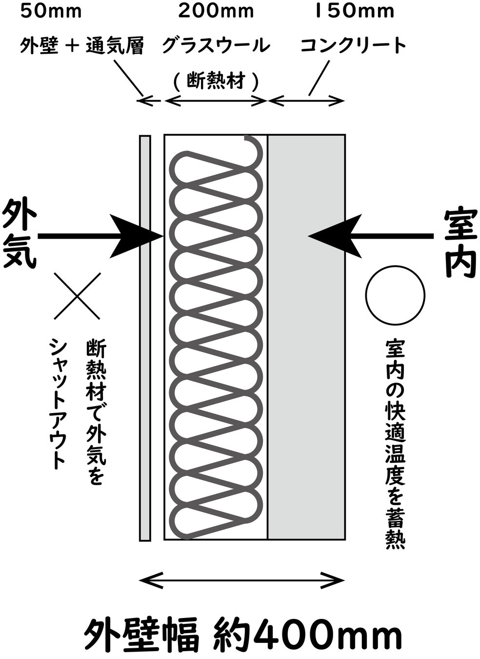 厚さ200mmの外断熱(壁)で外の温度をシャットアウト