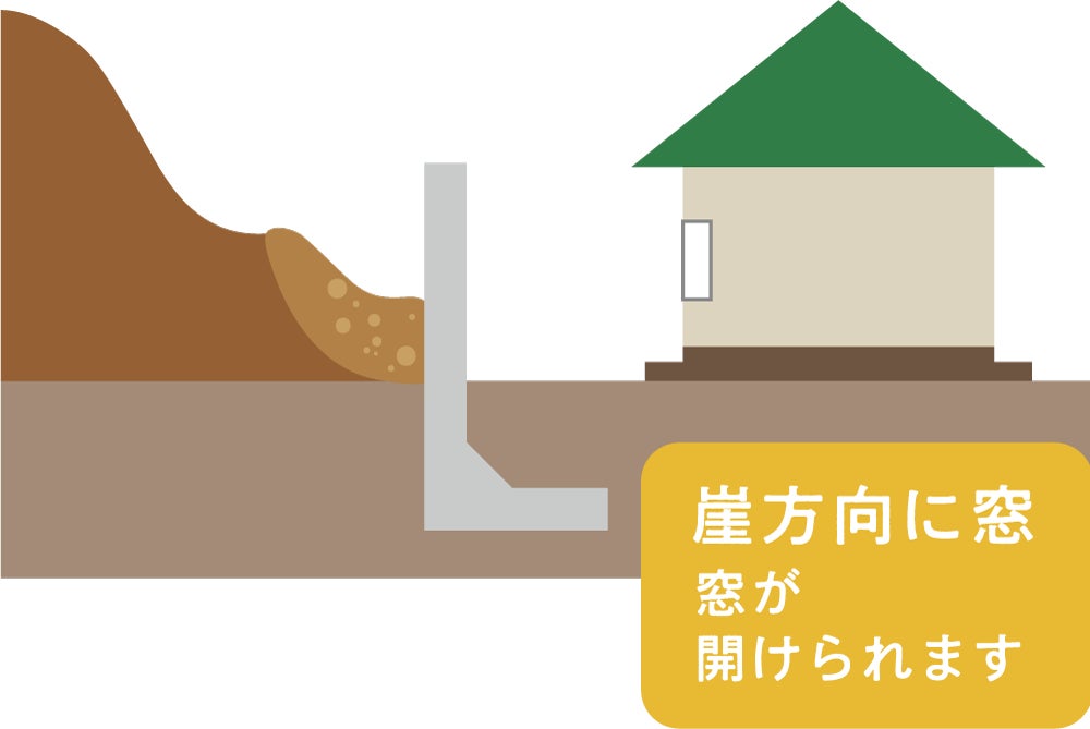 弊社の土砂待ち受け塀(塀のねっこ)であれば、崖方向にコンクリート壁を外構として建てることで、窓を開けることが出来る住宅を建てることが出来ます。