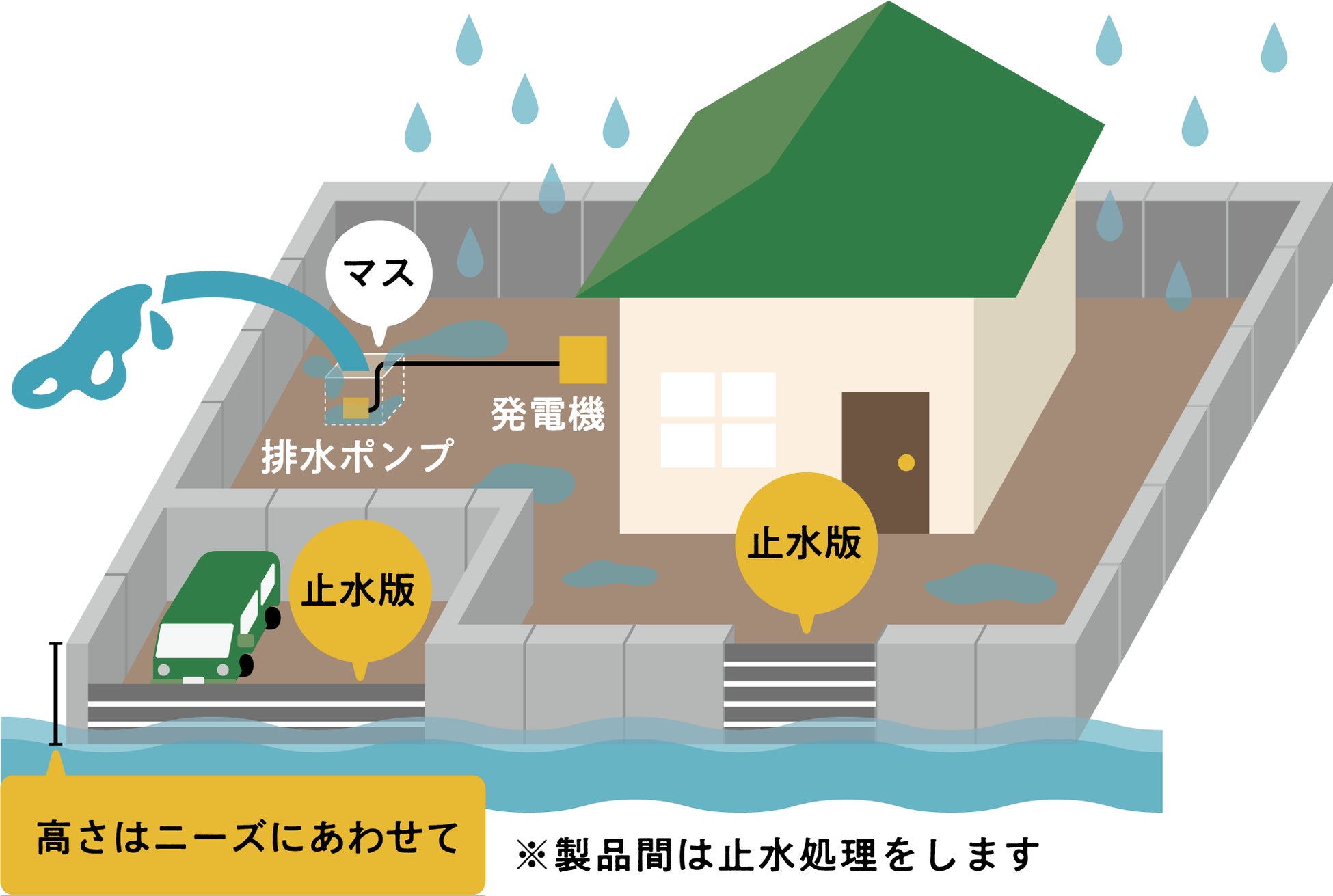 これまでの弊社の開発してきた浸水防止塀(塀のねっこ)などと組み合わせた浸水防止対策により住宅だけに頼らない強みを生かします。
